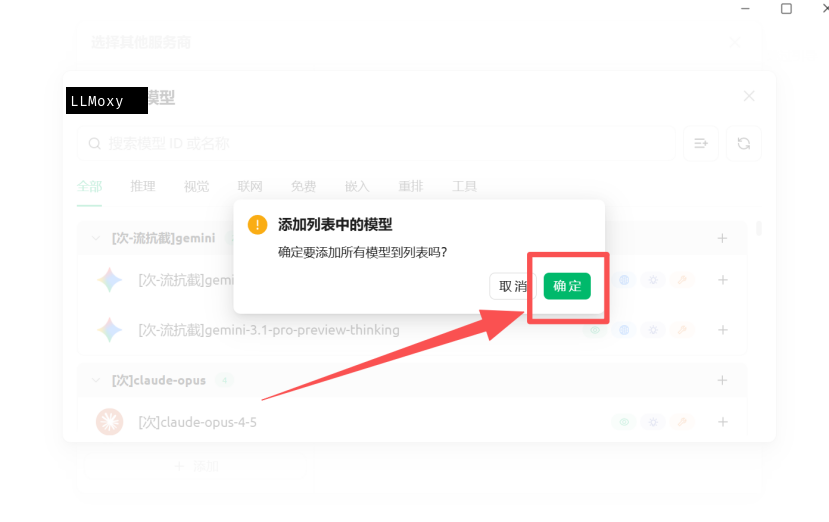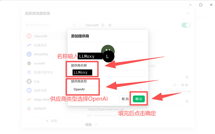 - 填入 供应商名称 (如:LLMoxy)和 类型 后点击 确定