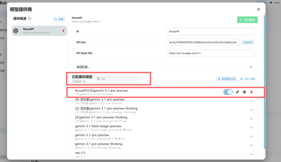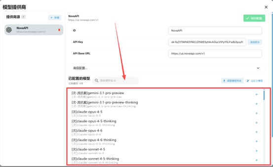 填入 ID、API Key、API Base URL 后点击 保存配置,然后点击 获取模型。