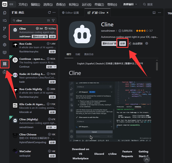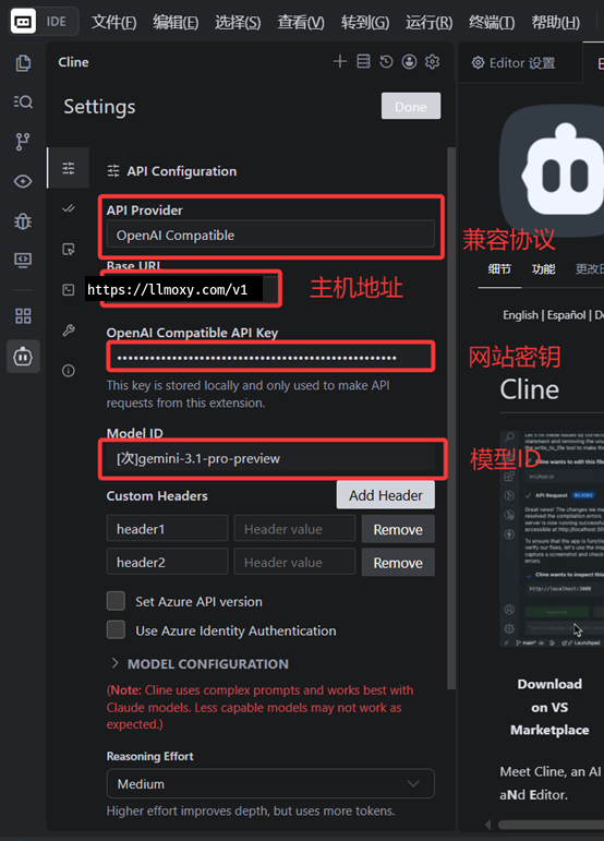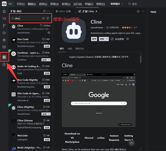 💡 提示 请使用 auto 分组的令牌。配置完成后即可在 Trae 中使用 Cline 插件。